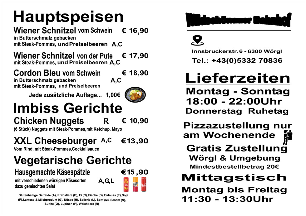 von Freitag bis Mittwoch von 18-22.00 Uhr in Wörgl und Umgebung! (mind. Euro 20,- Bestellwert)